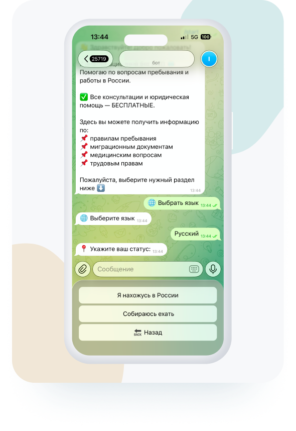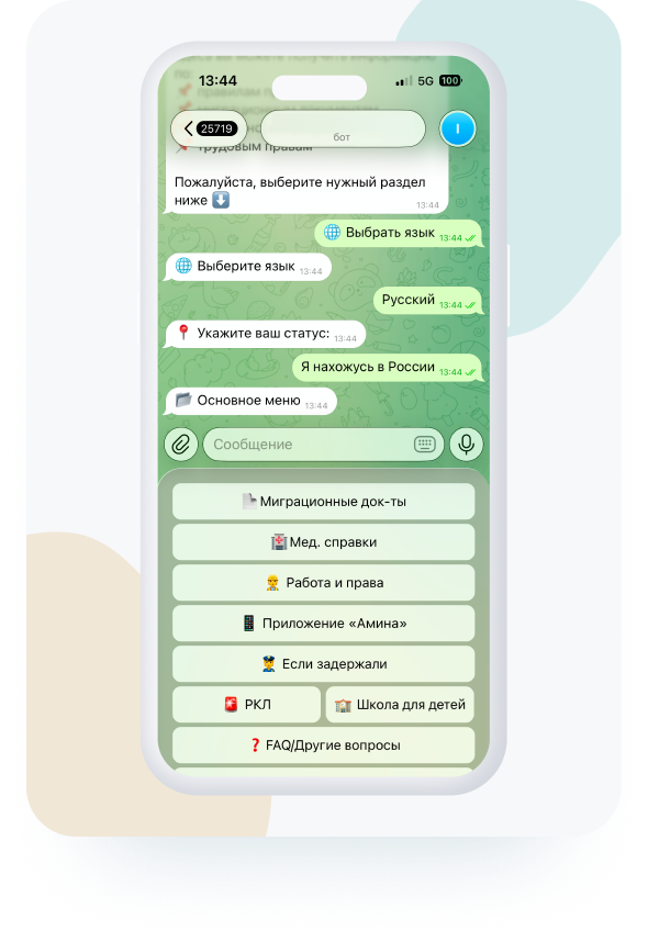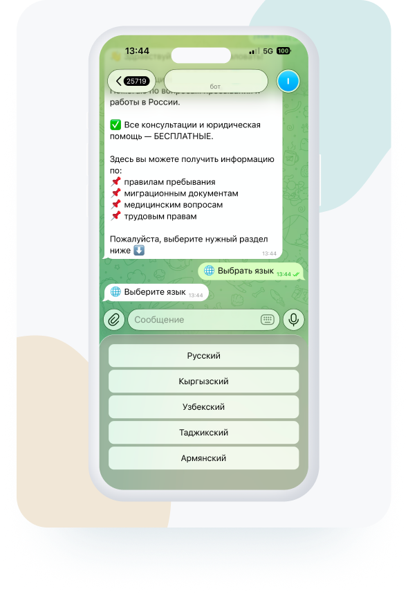 Вы выбираете язык и страну — дальше бот ведёт вас по теме и даёт понятные ответы.